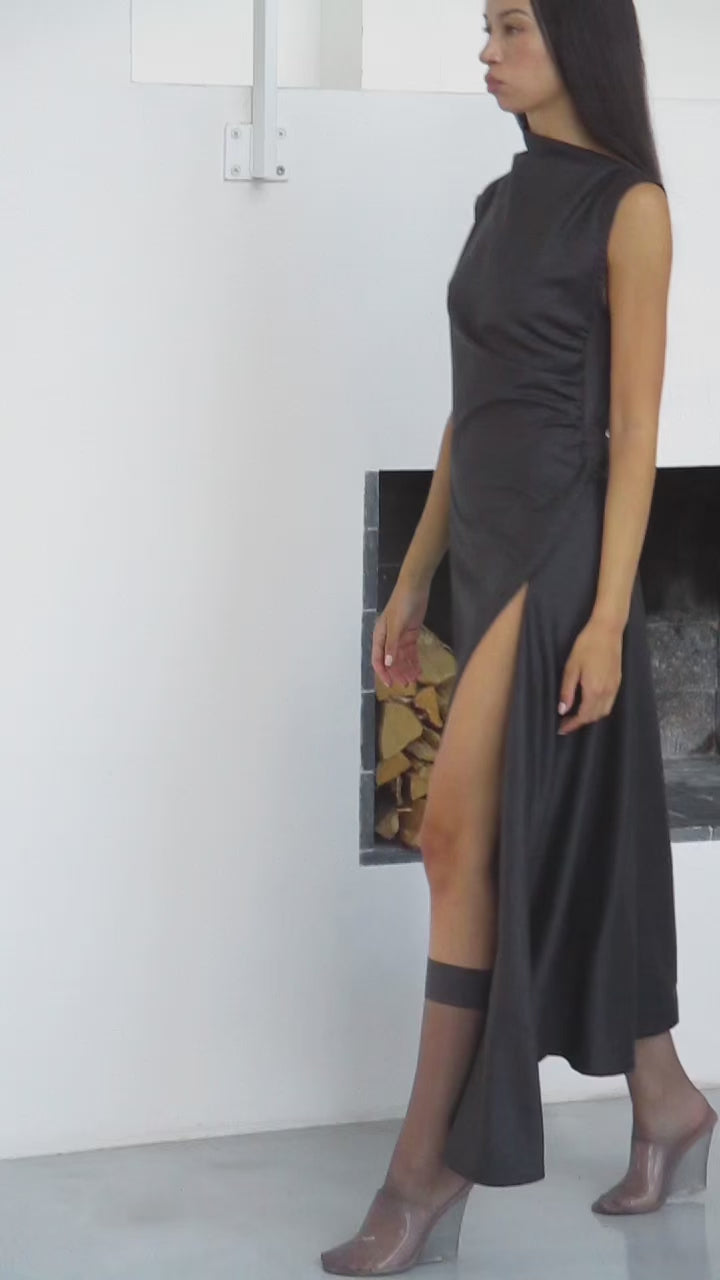 Asymmetric Suit Dress With Open Back is cut with an asymmetric design and a hook-and-eye closure that extends from the back to the front side. Crafted from 100% wool fabric.