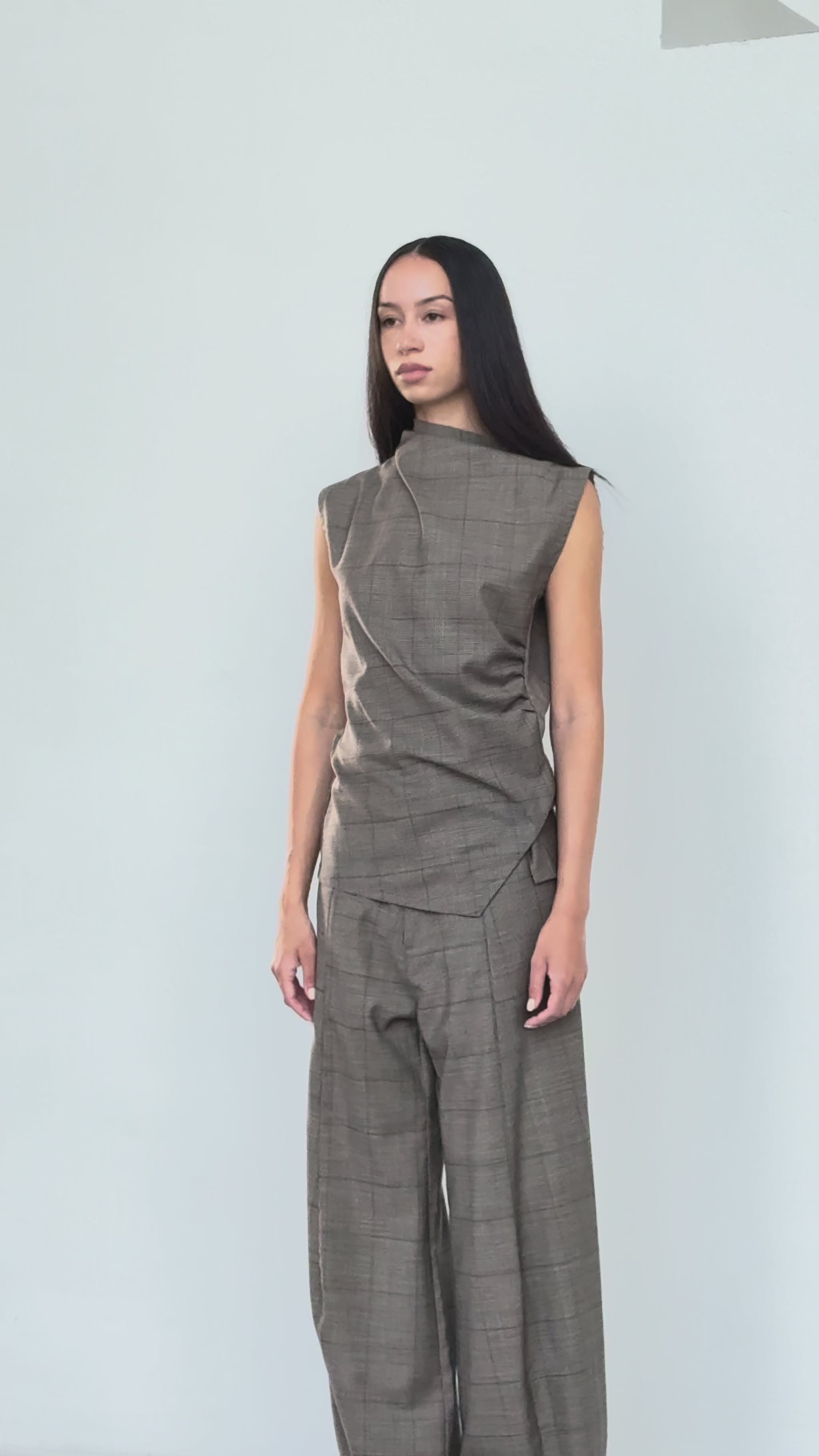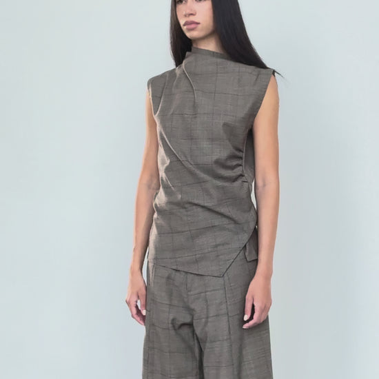 Asymmetric Top with Open Back is cut with an asymmetric design and a hook-and-eye closure that extends from the back to the front side. Featuring a check pattern and crafted from 100% wool.