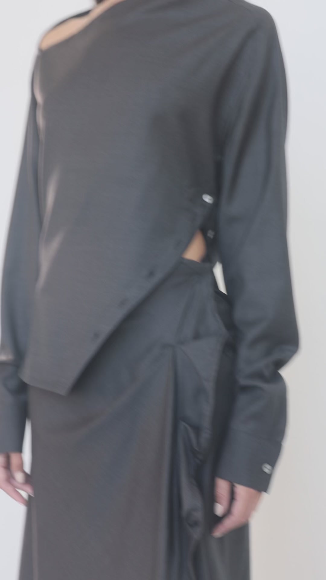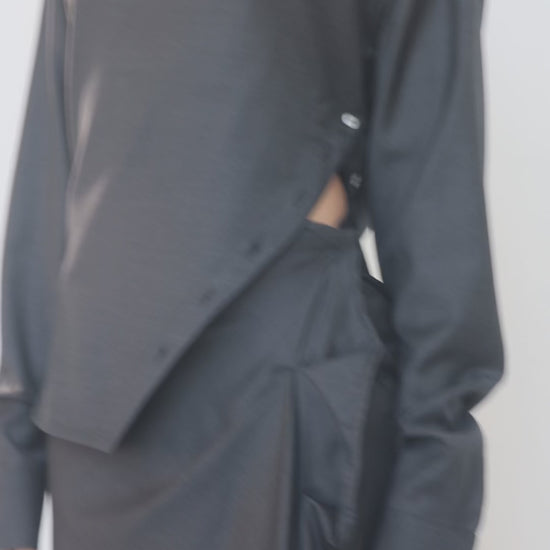 Open Shoulder Suit Top is cut with an asymmetric design and off-shoulder detail. Crafted from 100% wool fabric.