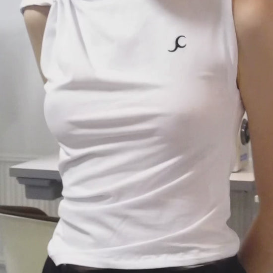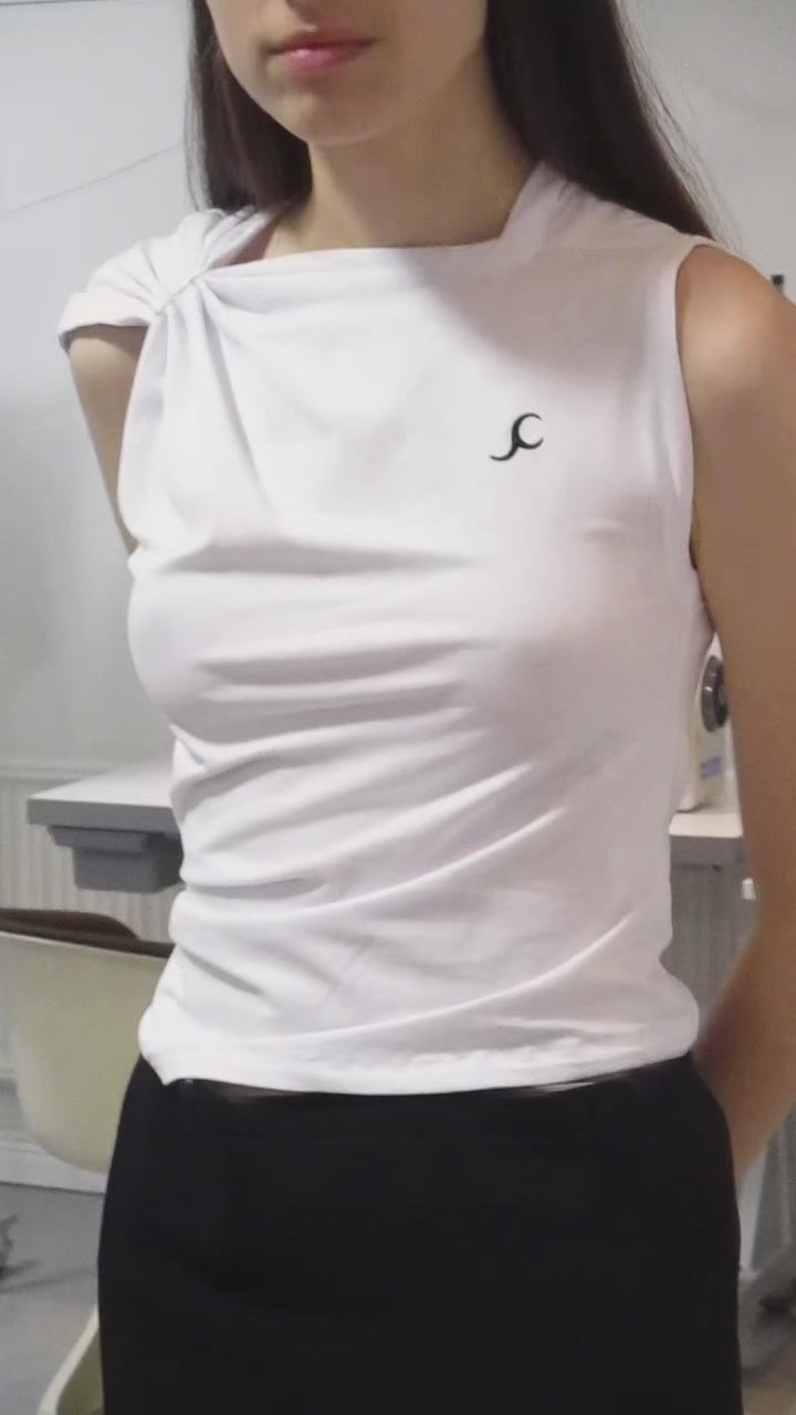 The "Twisted T-Shirt" features draping throughout and includes a small metal chain detail at the shoulder.